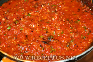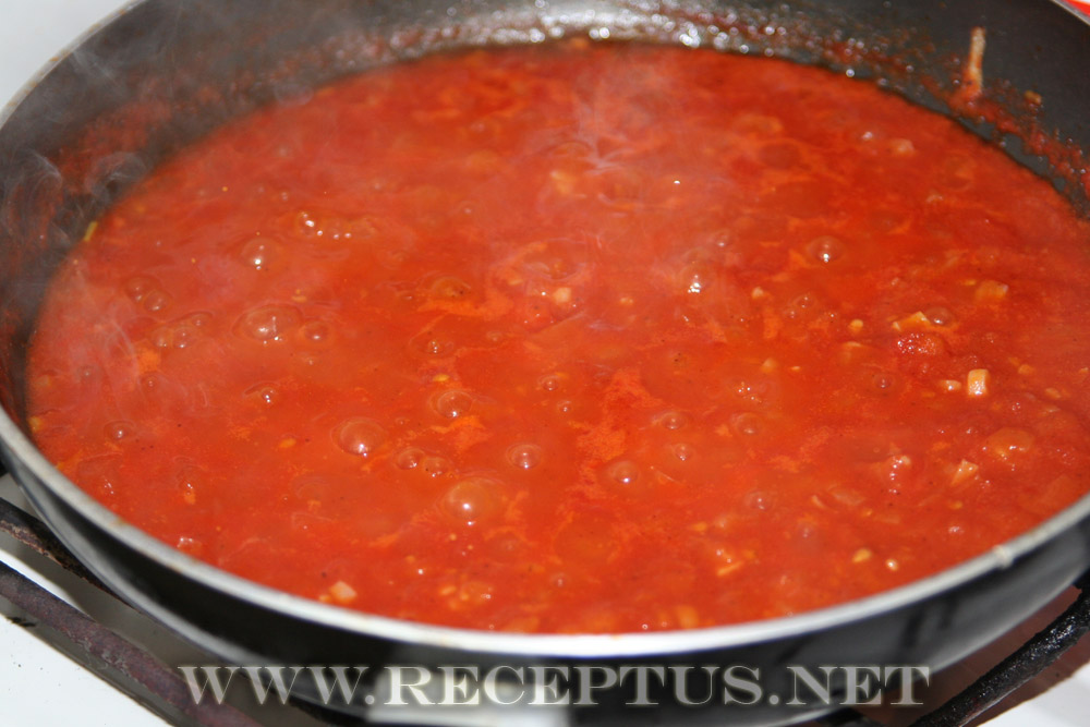 - Добавить туда помидоры, пасту, вино. На среднем огне, без крышки, помешивая, выпаривать жидкость минут 15